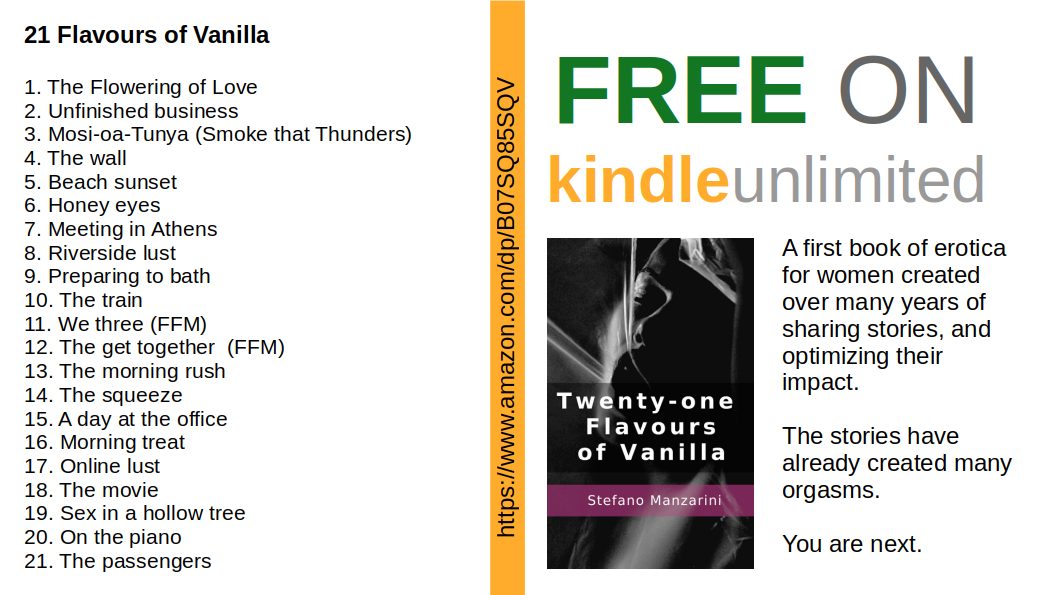 storymanza Rookie Scribe 28 Jun 2019 My book, Twenty-one Flavours of Vanilla (which is not all that vanilla actually) is now available on Kindle and Kindle Unlimited. It started out as stories that I posted to Lush, but have since taken down, but will be posting some new ones soon. You can get it on all the Amazon sites.